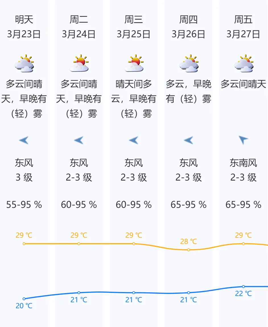 预计3月23日-25日,深圳市多云到晴天,早晚有(轻)雾;