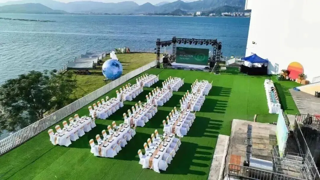 绿角草坪、白色天幕,配上一望无垠的大海