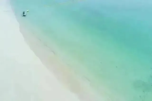 整个沙滩呈月牙状,镶嵌在碧海蓝天之间