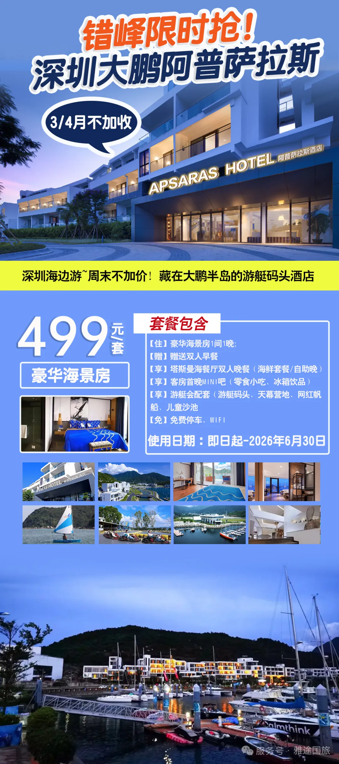 ¥499抢【深圳大鹏·七星湾·阿普萨拉斯酒店】豪华海景房+双人自助早餐+海鲜美食套餐+享mini吧,打卡游艇港+天幕营地