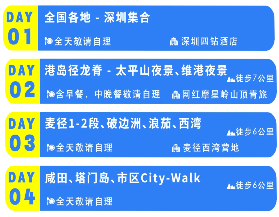 06:00 看海湾日出,洗涮,沐浴沙滩阳光;09:00 西湾出发到经过【咸田湾】到达赤码头坐大飞前往塔门岛;11:00 在【塔门岛】享受香港最美的海岛风情;下午回程到市区解散,可以约队友自由组队到【市区city-walk】,结束后按行程指引自行选择交通工具回家,或跟领队过关回内地;