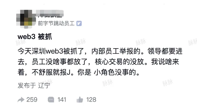 今天刷到一个重磅消息,前字节员工爆料:深圳某 Web3 团队被查处,竟是内部员工实名举报!最终处理结果很明确,团队领导悉数被带走,普通员工经查实不知情后都被释放,只有参与核心交易的相关人员,还在接受调查。这事儿也给所有打工人提了个醒:职场中发现不对劲,及时报警,小角色只要没参与违法操作,基本都能全身而退。