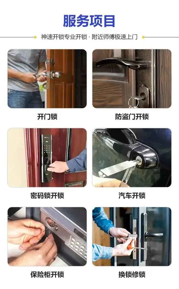 ——— 🔧 服务内容 ———🔑 家庭开锁(防盗门、卧室门、木门等)🔑 汽车开锁(各类车型🚗)🔑 指纹锁安装与维修🔑 更换锁芯(A级/B级/C级安全升级)🔑 开保险柜、文件柜🔑 门锁维修、卡锁处理🔑 智能门锁安装与调试
