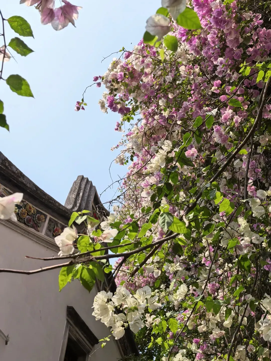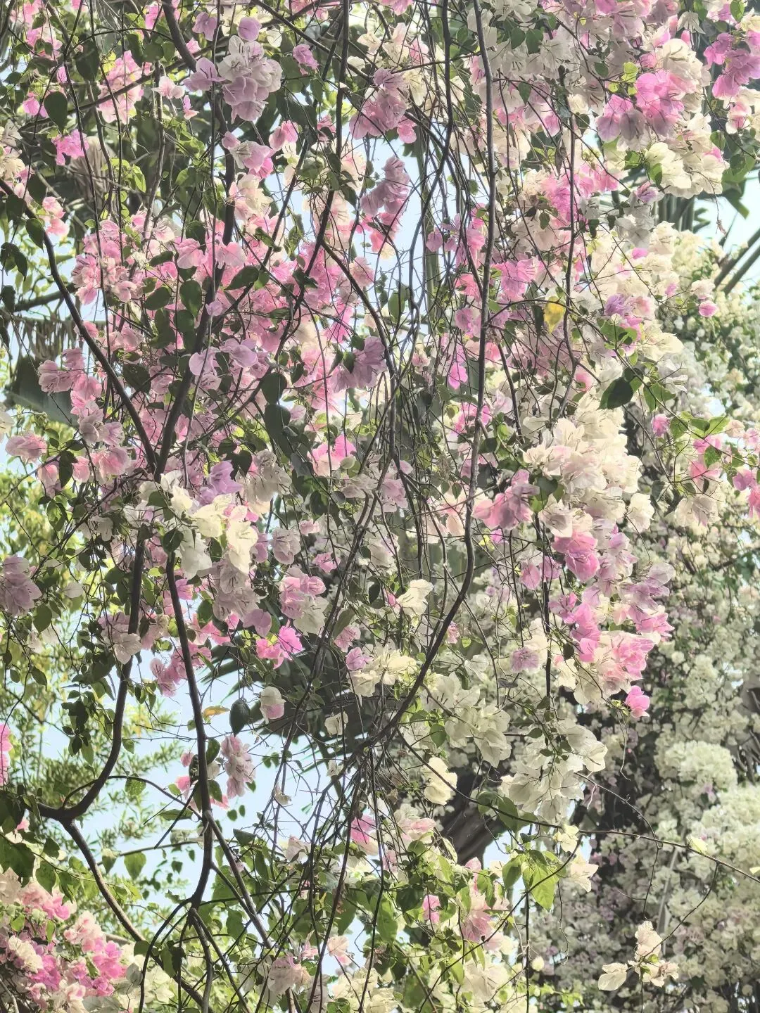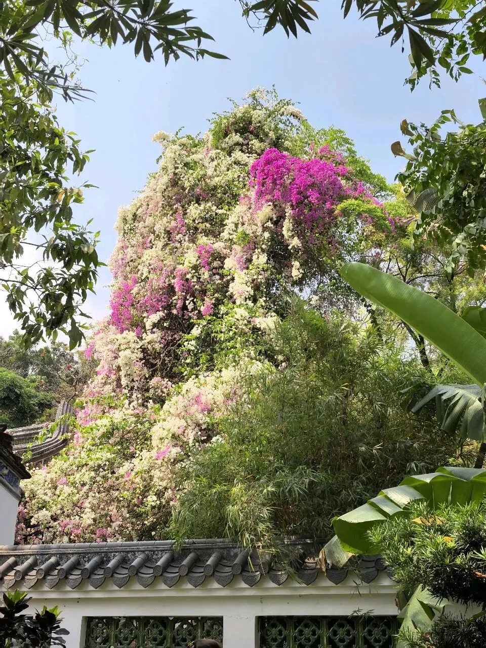 那株蛰伏一整年的广红樱老树如期盛放,三角梅“花妖”的名号果然名不虚传,粉白交织的花瀑自枝头倾泻。