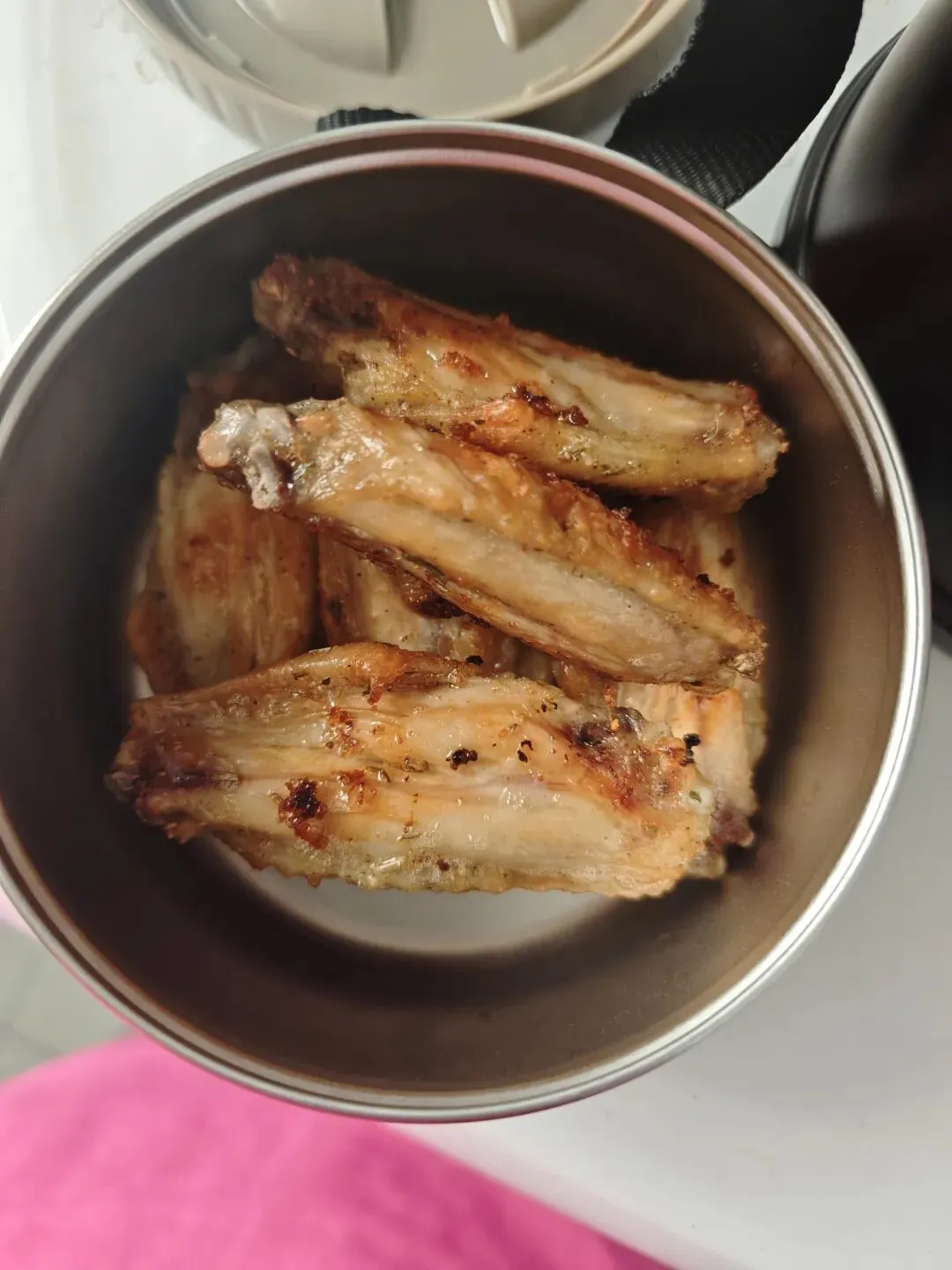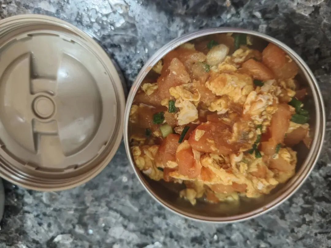 娃的午餐,番茄炒蛋和烤鸡翅,他用的是保温饭盒,因为学校没有微波炉,我用普通饭盒就好了,中午可以在公司微波炉加热。