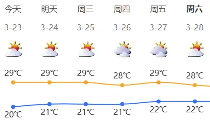 未来一周,深圳没有明显降水,天气炎热。其中,3月23日,多云间晴天;3月24日至29日,多云到晴天,早晚有(轻)雾,间中偶有阵雨,气温回升,中午前后体感炎热,最高气温逼近30℃。全市森林火险黄色预警信号持续生效中,要继续做好森林防火和城市用火用电安全管理。详情点>>>