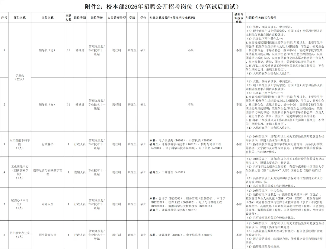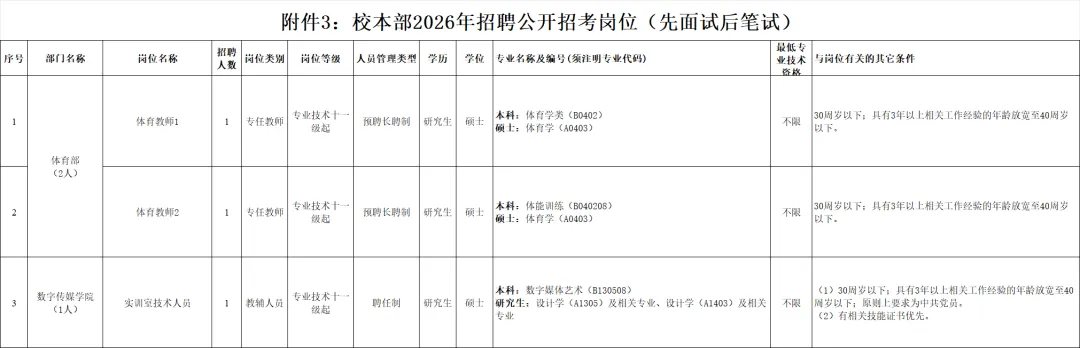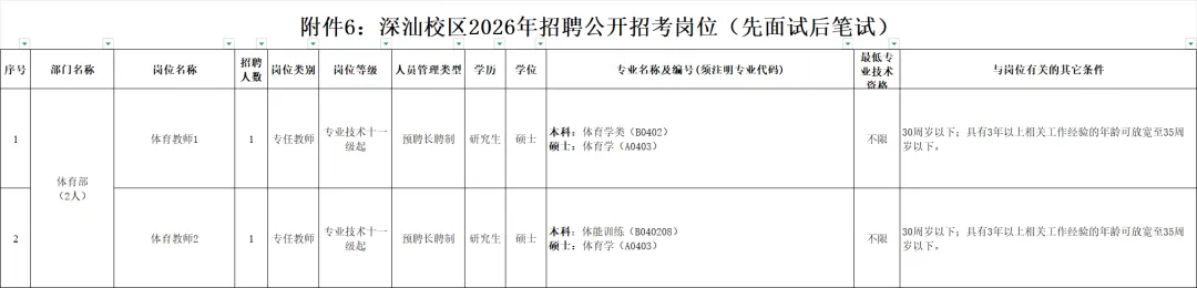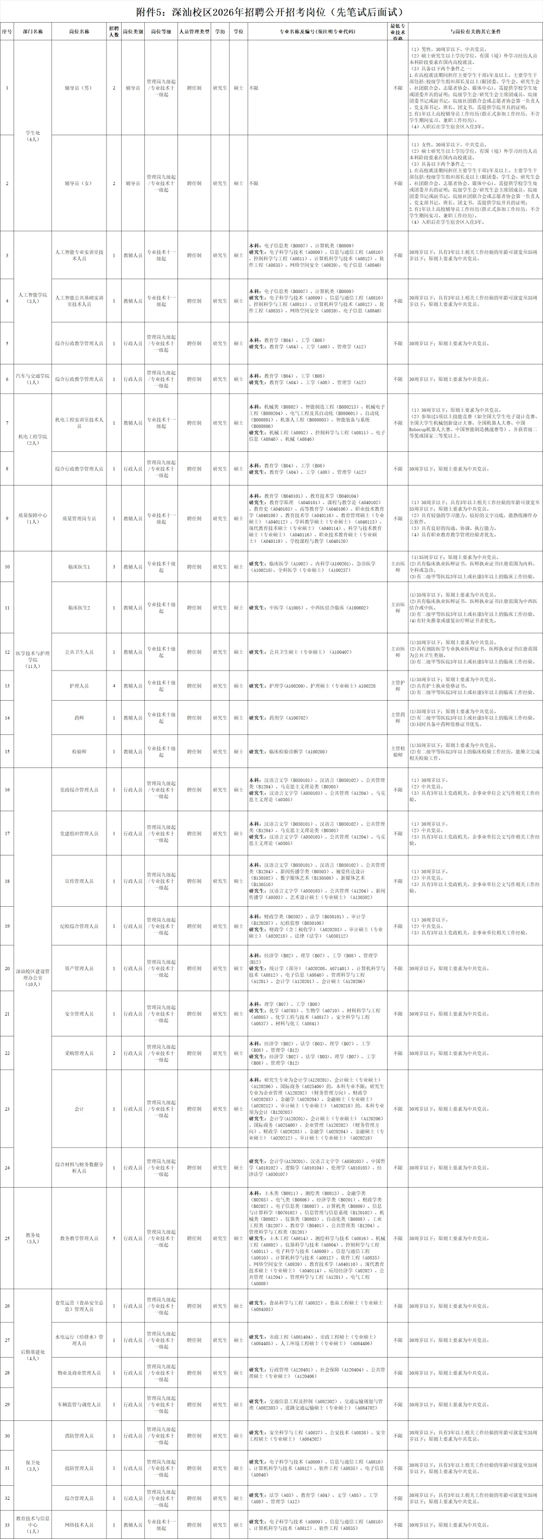3.具有良好的政治素质和道德品行,履行我校教职工义务;1.报名时间:2026年3月17日9:00至2026年3月27日17:002.报名方式:网上报名。应聘者注册并登录以下网址报名:https://sign.2eju.com。附件1和附件4岗位:部门初试(30%)+学校面试(70%)。部门初试由各部门自行组织,通过综合素质考察、专业能力考核、面试等形式考察报考人员综合素质、教学能力和学术水平,同时由学院党委(党总支)通过谈话、函询等形式对师德师风和思想政治表现进行初步考察。具体初试方式、时间、地点等,由各部门另行通知。(1)附件2和附件5岗位:笔试(40%)+综合素质考察(20%)+学校面试(40%)。①笔试。学校根据岗位类别和条件确定笔试科目及各科目在笔试总成绩的比例分配。笔试全部采用闭卷考试的方式。每科目答题时间均为90分钟,试卷满分100分。②综合素质考察。笔试成绩排名在拟聘人数6倍内人员入围综合素质考察。综合素质考察可采用结构化面试、技能实操、业务能力考核、通讯评审等形式进行,满分100分。③学校面试。笔试+综合素质考察成绩排名(按笔试40%+综合素质考察20%的原则计算)在拟聘人数3倍内人员入围学校面试。学校面试主要考核应聘人员业务能力素质,满分100分。按照综合成绩高低排序确定拟录用人员,学校面试成绩60分以下者不予录取。同一岗位总成绩相同的,按照笔试、面试、综合素质考察顺序对比单项成绩,成绩高的确定为拟录用人员。具体考核时间、成绩公布等信息另行通知。(2)附件3和附件6岗位:综合素质考察(20%)+实操面试(40%)+笔试(40%)。①综合素质考察。综合素质考察可采用结构化面试、技能实操、业务能力考核、通讯评审等形式进行,满分100分。②实操面试。综合素质考察成绩排名在拟聘人数6倍内人员入围实操面试。实操面试通过实操展示、课程试讲、专业问答等形式考察应聘者专业技能和教学专业能力,满分100分。③笔试。综合素质考察+实操面试成绩排名(按综合素质考察20%+实操面试40%的原则计算)在拟聘人数3倍内人员入围笔试。学校根据岗位类别和条件确定笔试科目及各科目在笔试总成绩的比例分配,笔试全部采用闭卷考试的方式。答题时间为90分钟,试卷满分100分。按照综合成绩高低排序确定拟录用人员,学校面试成绩60分以下者不予录取。同一岗位总成绩相同的,按照笔试、面试、综合素质考察顺序对比单项成绩,成绩高的确定为拟录用人员。具体考核时间、成绩公布等信息另行通知。学校对拟聘人员名单审议通过后将组织体检和审档考察。通过体检和考察的人员名单将在深圳职业技术大学网站(https://www.szpu.edu.cn)上公示5个工作日。(一)用人方式。本次招聘的教师全部为员额制人员,其中专任教师和专职研究人员按预聘-长聘制聘用管理,行政教辅人员和辅导员按聘任制聘用管理。(二)薪酬待遇。学校提供具有竞争力的薪酬待遇,具体薪酬以学校相关规定为准,按照学校同类人员标准执行,学校具有完备的薪酬年度晋升机制。(三)提供租金优惠的公租房、保租房等校内外周转住房,符合条件者可享受深圳市人才房政策。(四)拟聘人员符合深圳市有关人才补贴申领条件的,可按照深圳市有关规定申请相关补贴,具体以上级有关政策规定与要求为准。