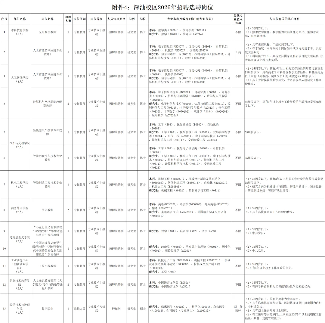 深圳职业技术大学是一所公办本科层次职业院校,其前身是1993年创建的深圳职业技术学院。我们竭诚欢迎海内外人才加入深圳职业技术大学,充分施展才华,携手共建创新高地和人才中心,为职业教育高质量发展贡献力量!现将有关事项公告如下: