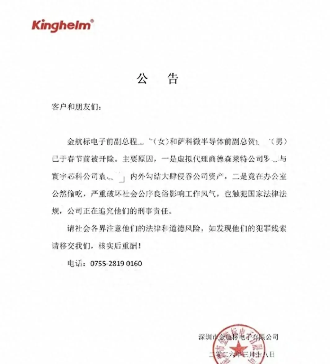 事情的起因,是深圳金航标电子有限公司于3月18日发布的一则官方公告,公告盖有公司公章,措辞严厉,直指公司前副总程某某(女)和关联公司萨科微半导体前副总贺某某(男),已于春节前被正式开除,核心原因有两点:一是二人勾结外部人员,大肆侵吞公司资产;二是在办公室公然做出不恰当行为,严重破坏职场风气,违背社会公序良俗,目前公司已启动刑事追责程序,同时面向社会征集二人的犯罪线索,核实后将给予重酬。