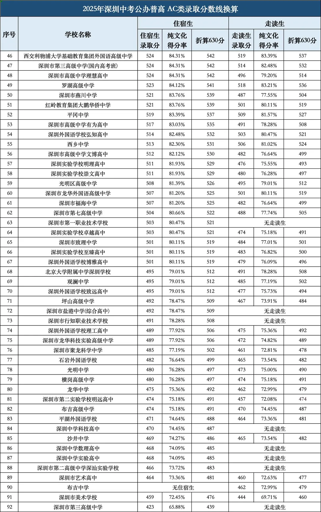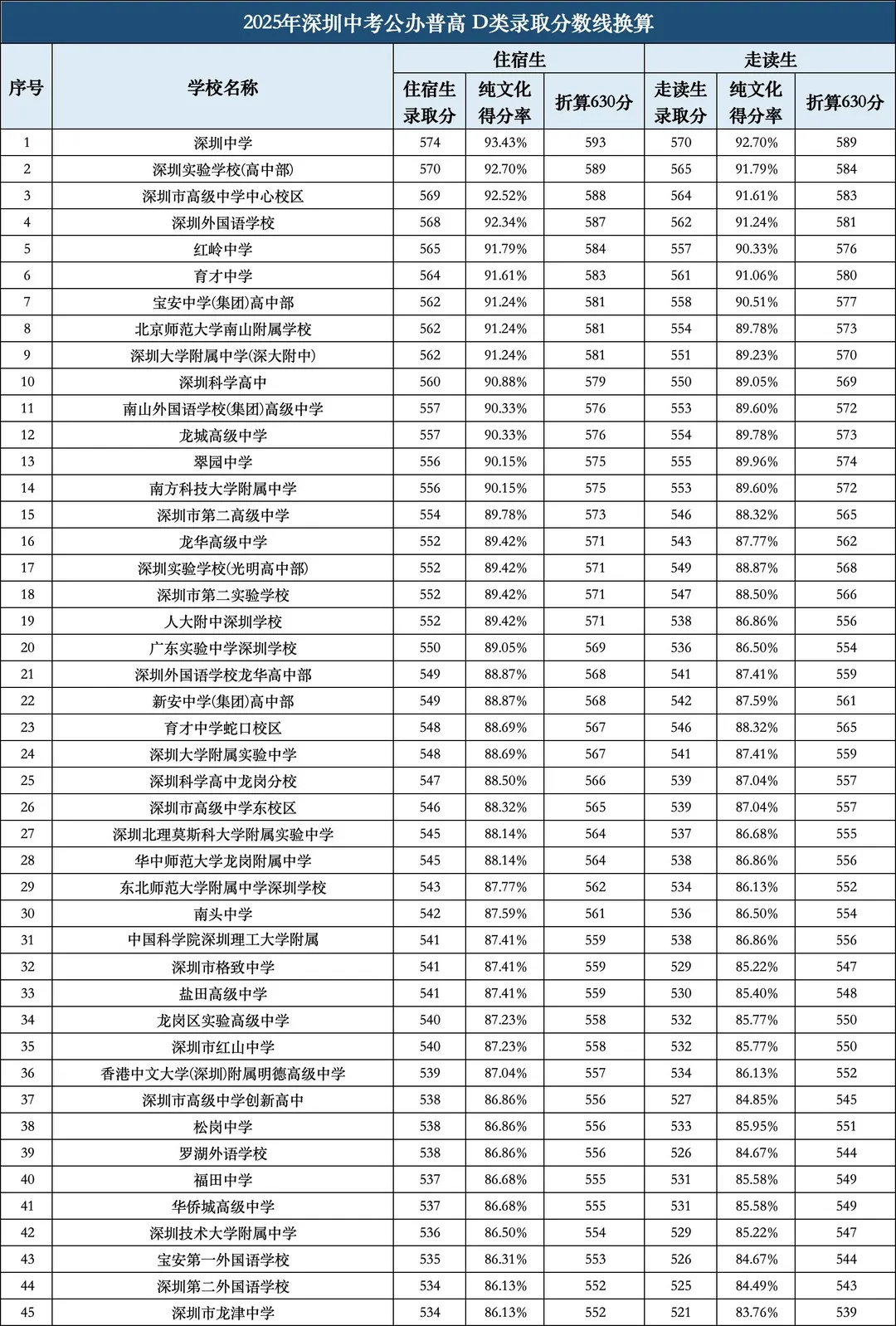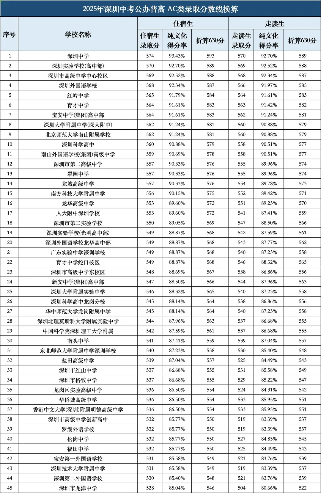 • 罗湖区:头部校(翠园中学)AC类570分、D类572分,普通公办校(罗湖高级中学)AC类535分、D类538分,性价比突出。