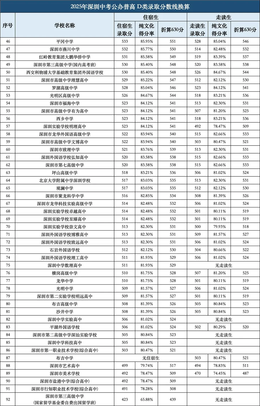 深圳市高级中学(中心校区) | 569分 | 569分 | 走读类分数线低1-2分 |