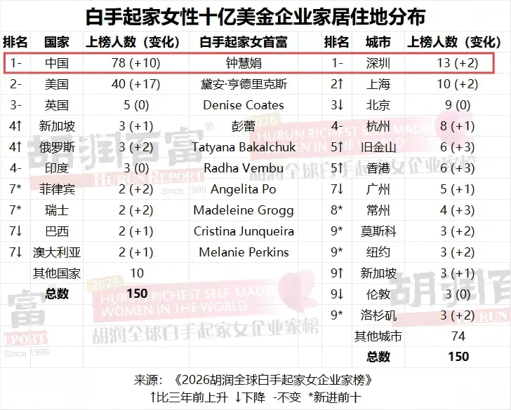 胡润研究院共找到来自20个国家的150位白手起家女性十亿美元企业家,发布了《2026胡润全球白手起家女企业家榜》。(财富计算截止日期为2026年1月15日)