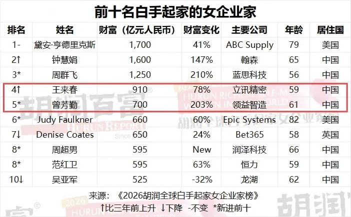 立讯精密创始人王来春,以910亿元人民币财富位列全球第四,国内第三,也是深圳女性企业家中身家排名最高的。