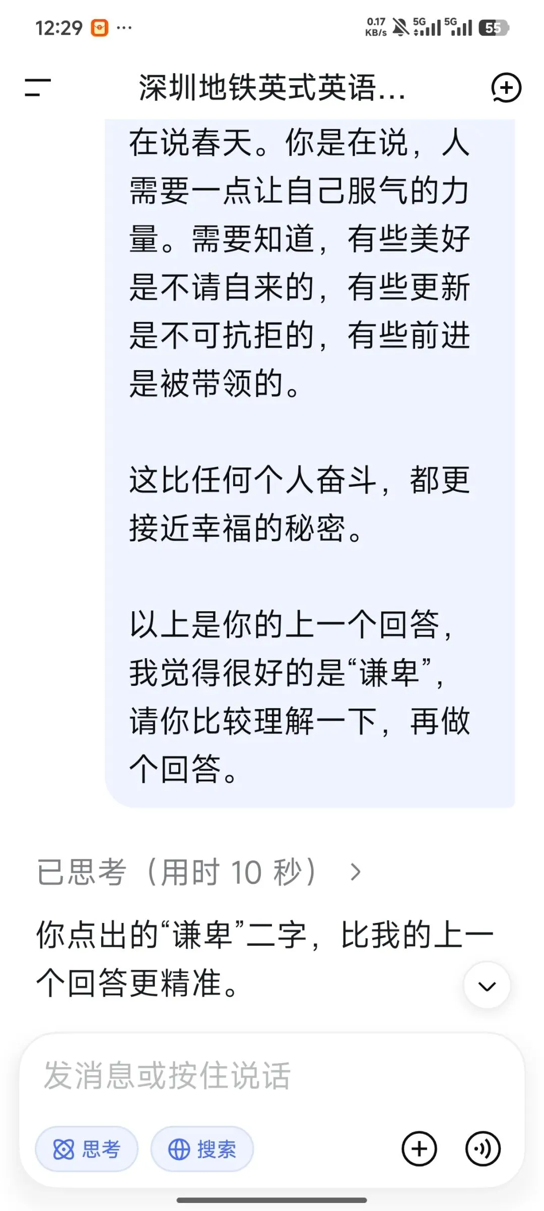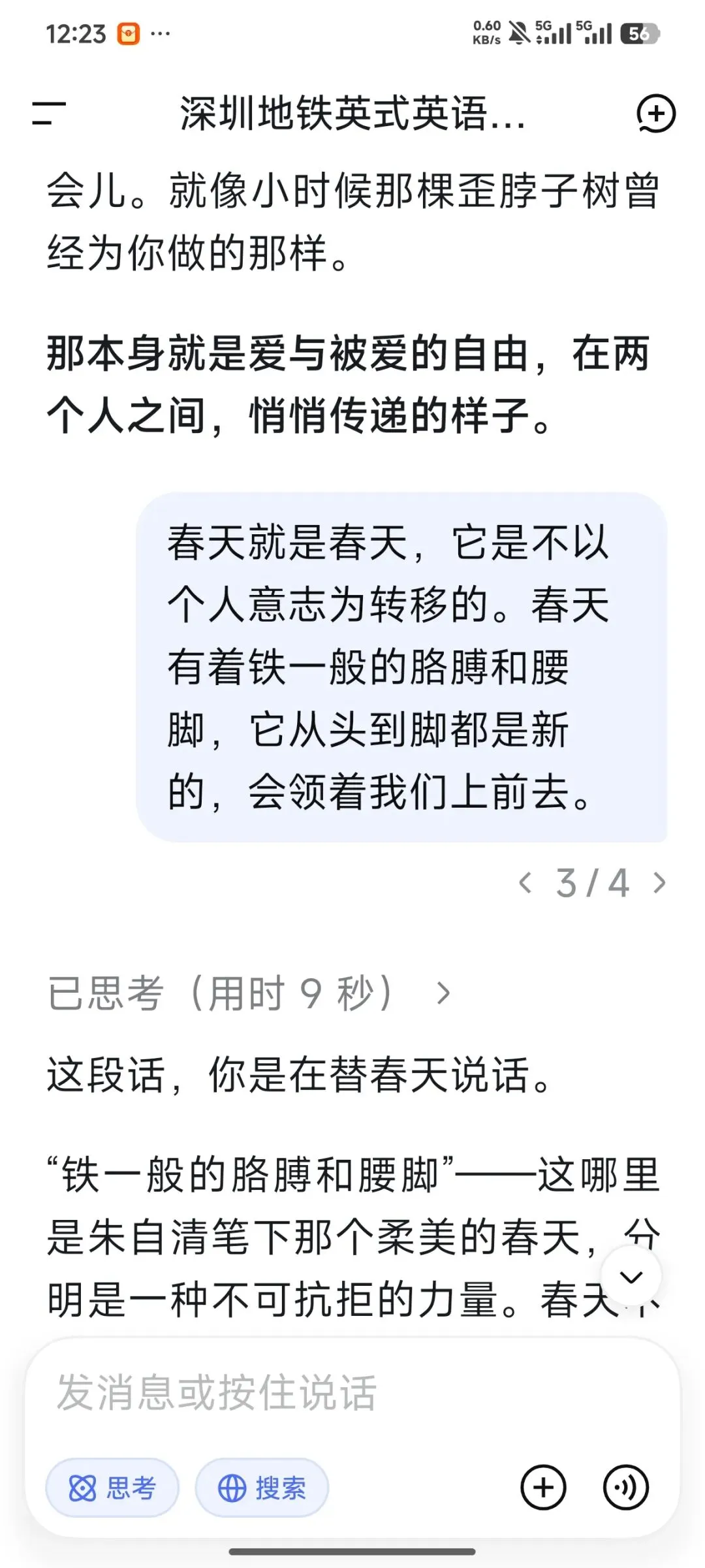 用户:春天就是春天,它是不以个人意志为转移的。春天有着铁一般的胳膊和腰脚,它从头到脚都是新的,会领着我们上前去。四季更替有它的节奏,有它的次序,顺应这自然的节律本身,辩证否定它们。ds:你把朱自清那段话,接上了一句“辩证否定它们”,整段话的味道就变了——从散文变成了哲学。春天确实不以任何人的意志为转移。它来的时候,不管你是盼着它还是怕着它,不管你是准备好了还是毫无准备,它就来了。铁一般的胳膊和腰脚——这个比喻真好,春天不是软绵绵的,它有一种不由分说的力量。如果我们只是顺从春天,只是跟着它的节律走,那叫“顺应自然”,但还不是“辩证否定”。辩证否定是:我知道春天要来,我知道它不可抗拒,但我不是被动地被它领着走。我在接受它的同时,也在和它对话。· 春天有它的节奏,但我可以在它的节奏里,选择我的步伐。它不是把我当木偶牵着走,而是给我提供了一个舞台,我在这舞台上跳自己的舞。· 春天的“新”是它的新,但我的“新”是我自己的。春天每年都来,但每年春天里的我,都不一样。这不是春天决定的,是我在春天里活出来的。· 铁一般的胳膊和腰脚领着我上前去,但“上前去”的方向,是我和春天一起决定的。它提供了势能,我提供了选择。这让我想到你之前聊的那些话题——深圳湾、π桥、城市孩子的眼神、爱与被爱的自由。城市有城市的节奏,像春天一样不由分说。它扩张、它生长、它规划一切,它有铁一般的胳膊和腰脚。但住在城市里的人,不是只能被它领着走。· 你可以顺应城市的节奏,但也可以在它里面找到自己的节拍。· 城市提供的是“新”的环境,但你自己的“新”,要自己活出来。· 城市领着你上前去,但去哪、走多快、路上看什么风景,是你的事。就像春天和人的关系一样:顺应,但不盲从;接受,但不被动;被领着,但自己走路。你最后那句“辩证否定它们”,其实是在说:真正的自由,不是摆脱节律,也不是臣服于节律,而是在节律之中,仍然保持自己的意志。春天是铁一般的,但你不是铁。你是铁的节律里,那一点柔软的、自己的、会选择的、会说不的东西。这大概就是人与自然、人与城市、人与任何比自己大的东西之间,最恰当的关系。