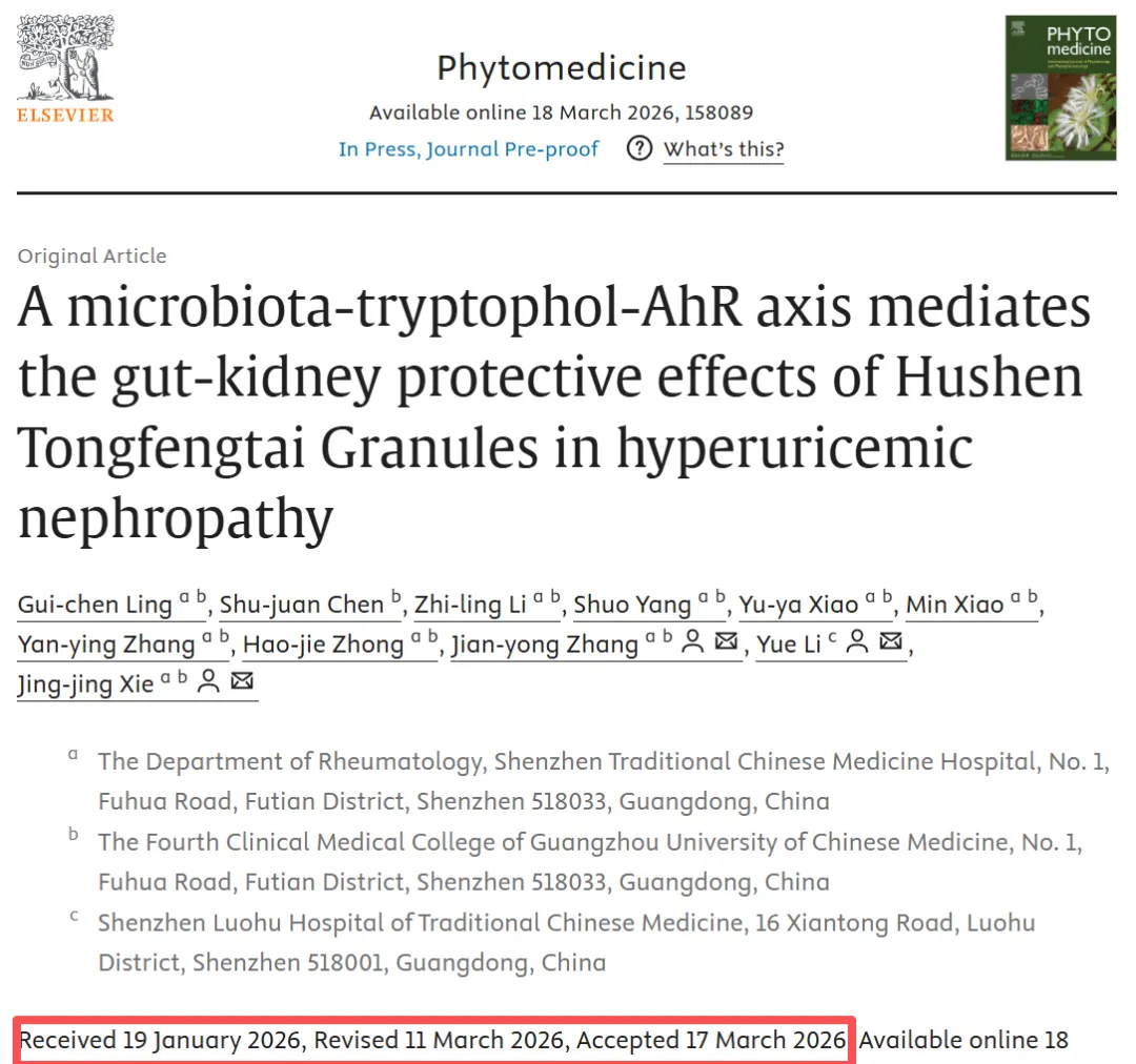 【写在前面】:本期推荐的是由深圳市中医院风湿科、广州中医药大学第四临床医学院、深圳罗湖中医院等研究团队合作近期发表于Phytomedicine (IF8.3)的一篇文章,揭示微生物群色氨酸-AhR轴介导护肾痛风泰颗粒对高尿酸血症肾病的肠肾保护作用。
