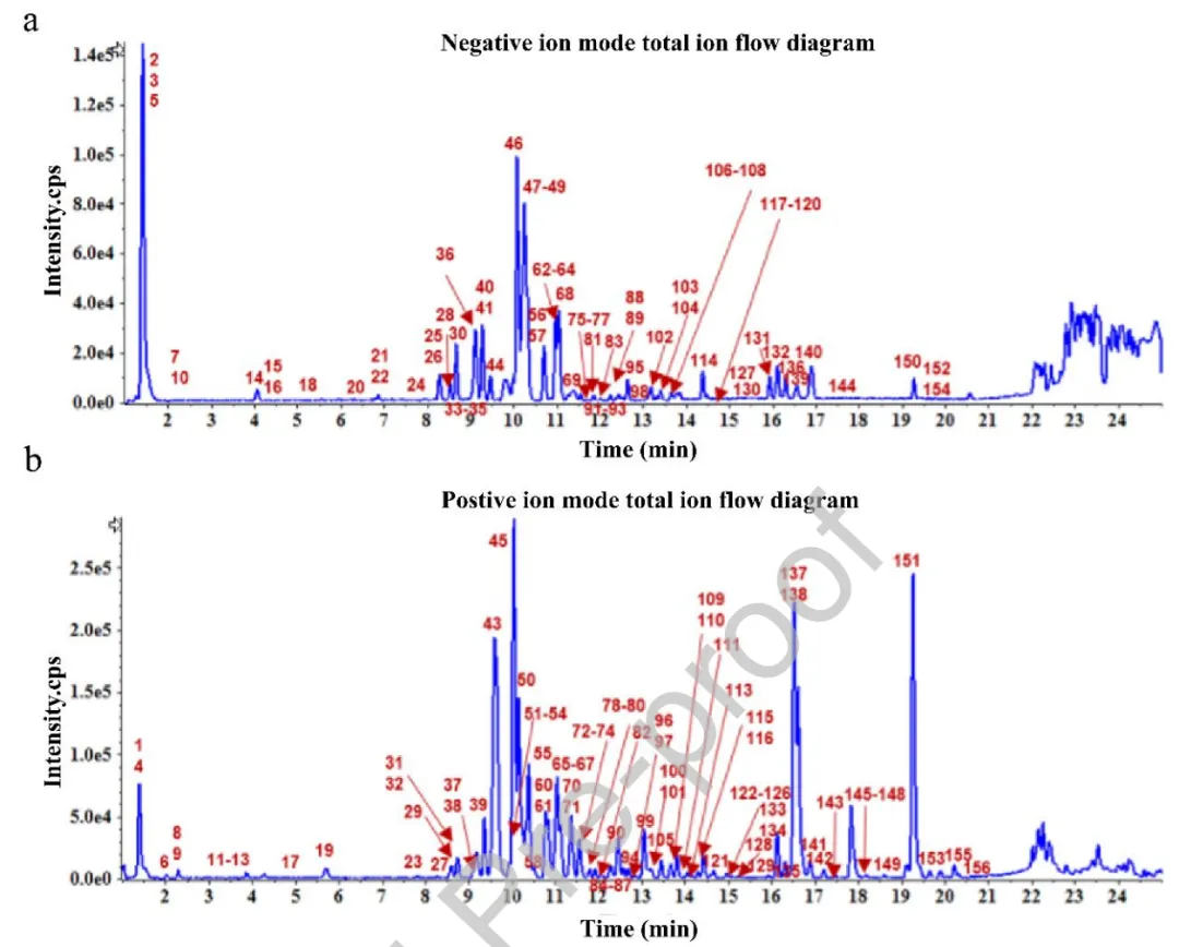 高尿酸血症(HUA)是一种代谢紊乱,其特征是血清尿酸水平升高,主要是由于肾脏和肾外排泄受损。持续的尿酸盐超负荷可导致高尿酸血症性肾病(HN),其中尿酸盐晶体沉积在肾小管和间质中,引发氧化应激和炎症反应。这些过程驱动肾小管损伤和间质纤维化,加速进展为终末期肾病。根据2021年全球疾病负担研究,预计到2050年痛风患病率将达到9580万例,比2020年增加72.6%。这对于肾脏人群尤其令人担忧,因为高尿酸血症的患病率随着疾病的严重程度而升高,影响了60%以上的晚期肾衰竭患者。黄嘌呤氧化酶抑制剂,如别嘌呤醇和非布索坦,仍然是降低血尿酸的主要药物。然而,它们在预防肾损伤方面的有效性是有限的,长期应用经常受到安全性和耐受性问题的限制。因此,开发旨在解决尿酸积累,炎症和肾功能不全之间联系的机制的新策略至关重要。 中医(TCM)的特点是整体,多靶点的方法,并已证明对痛风及其肾脏并发症有临床益处。先前的研究表明,四妙丸和滋肾清热汤通过抑制NLRP3炎性体激活,减少氧化应激和抑制TGF-β/Smad信号传导来改善肾脏炎症和纤维化。护肾痛风泰颗粒(HSTFT)是一种基于中医理论开发的多药处方,多年来已用于痛风和痛风肾病的临床实践。HSTFT的多种生物活性成分,如环烯醚萜苷,三萜皂苷和类黄酮,可以通过肠道微生物群生物转化为活性代谢物。然而,HSTFT是否通过微生物群相关机制发挥其有益作用尚未阐明。 在这项研究中,我们旨在阐明HSTFT如何调节肠肾轴以减轻与HN相关的代谢和炎症紊乱。通过鸟枪宏基因组测序和代谢组学分析,我们发现HSTFT重塑了肠道微生物组,特别是富集了短双歧杆菌。肠道微生物群的消耗使HSTFT的保护作用无效,HSTFT通过短双歧杆菌重新定殖而恢复,支持微生物群依赖性机制。此外,代谢组学分析通过激活肠和肾中的AhR信号传导,并支持微生物-代谢物AhR轴作为HN的潜在治疗策略,进一步确定色氨酸是促进HSTFT肾脏保护和屏障恢复作用的关键代谢物。1.HSTFT的UPLC-QTOF/MS分析。