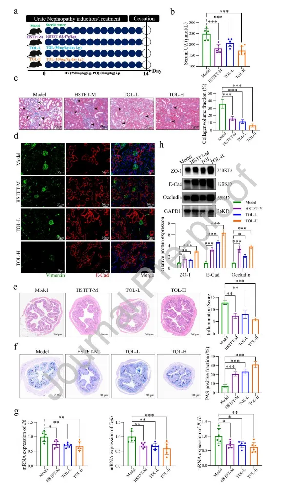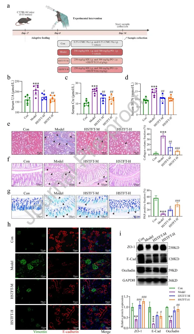 粪便宏基因组学和UPLC-ESI-MS/MS代谢组学用于鉴定由HSTFT调节的关键微生物类群和代谢物。抗生素处理的小鼠用于研究HSTFT的肠道微生物群依赖性机制。进一步进行体内和体外实验以验证HSTFT对HUA小鼠肠道生态失调和屏障功能障碍的改善作用。