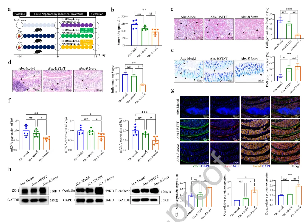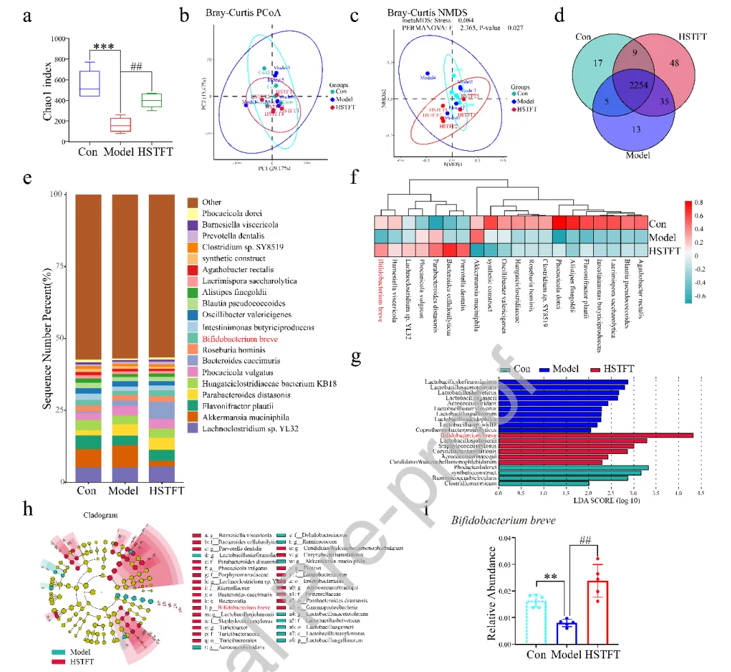 2.HSTFT 对高尿酸血症小鼠肾损伤及肠道屏障功能障碍的保护作用。3.HUA小鼠HSTFT治疗后肠道微生物群组成的改变和短双歧杆菌的富集。
