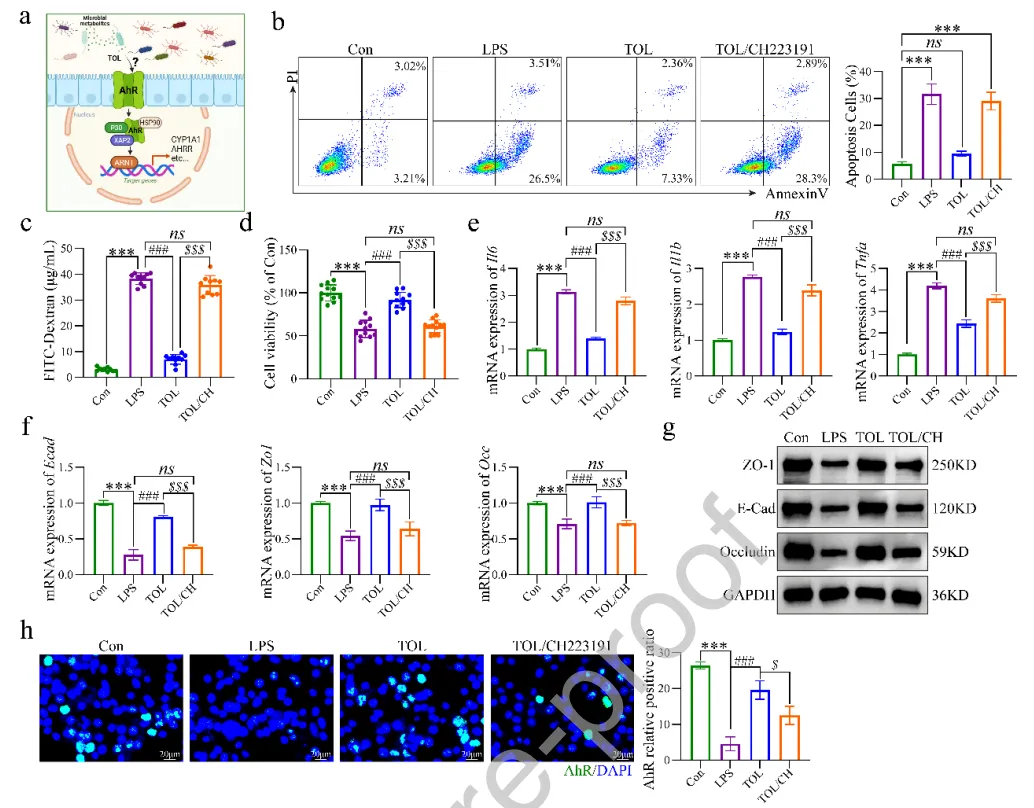 5.HSTFT重塑肠道微生物代谢,并将色氨酸鉴定为关键的功能代谢产物。6.色氨酸概括了HSTFT在尿酸肾病小鼠中的肾脏保护和肠屏障恢复作用。7.色氨酸通过激活AhR信号通路发挥上皮保护及抗炎作用。8.AhR在色氨酸介导的Hua小鼠肠道及肾脏保护作用中的参与评估。【结论与讨论】
