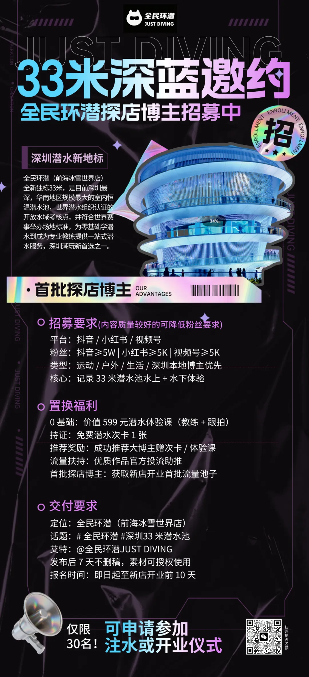 现招募首批探店博主,内容置换免费潜水体验及定向邀约参加新店开业前注水/开业仪式,0 基础/ 持证都能冲!