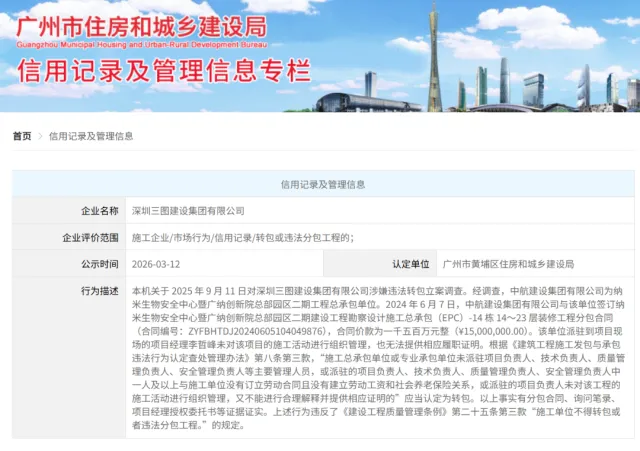 近日,深圳三图建设集团有限公司因涉嫌转包工程,被广州市住房和城乡建设局于上网公示。