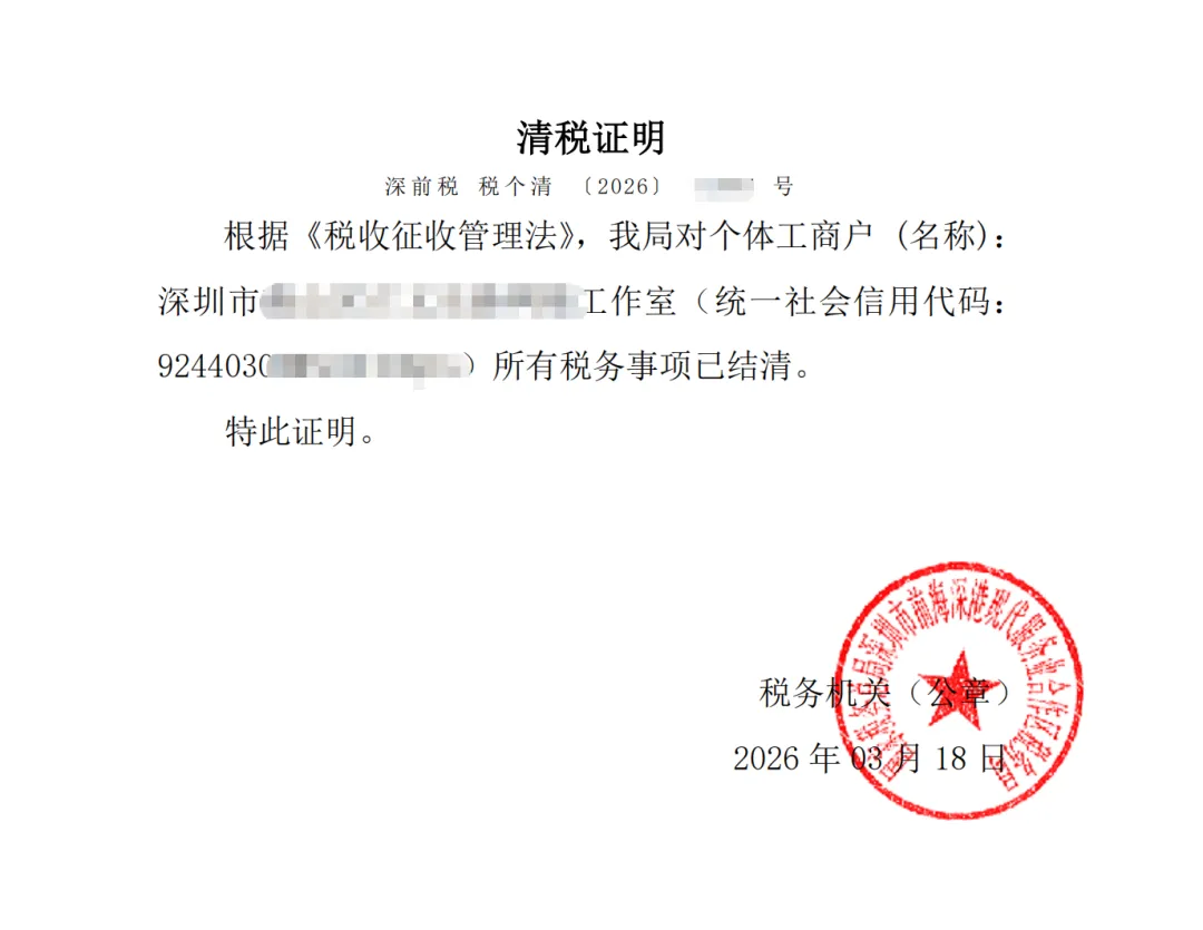 很多个体户老板误以为“没经营、没开票,就不用管税务”,这是注销被驳回的头号原因!根据深圳税务注销规定,无论个体户是否实际经营、是否缴税,注销前必须先完成税务清税,拿到《清税证明》(一般注销必备),否则工商注销直接驳回。