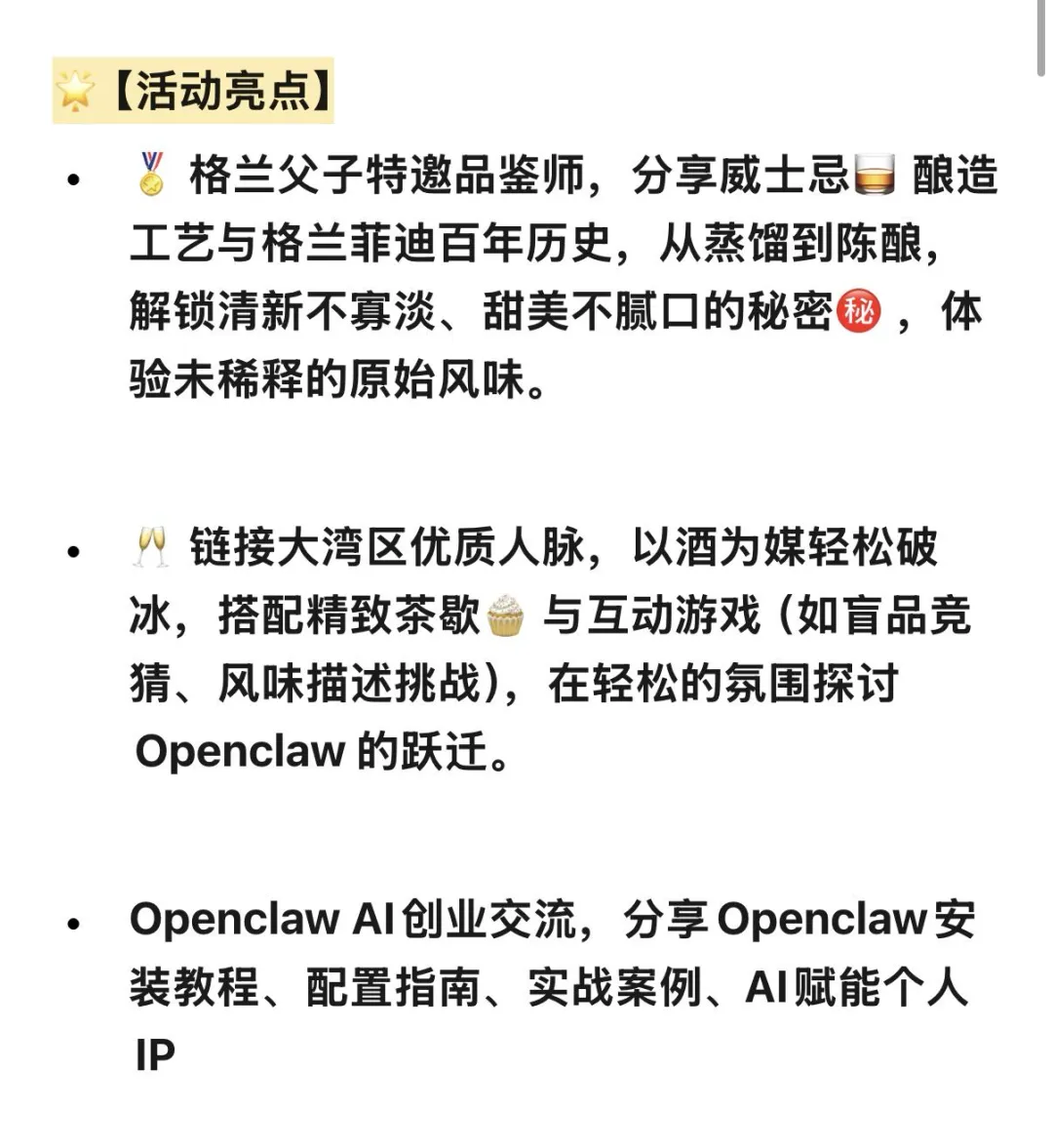 一场别开生面的Openclaw交流会&高定品🍷party3.26本周四晚6点|就在深圳南山!这场专属社交派对,为你解锁👉「高定」新定义—无需刻意应酬,品鉴格兰菲迪15年经典斯佩塞花果香双雪莉桶🍎,与同频者围坐畅谈AI主流Openclaw ,探讨Openclaw 是否从只动嘴的参谋变成能动手的士兵🤔 交换见解~