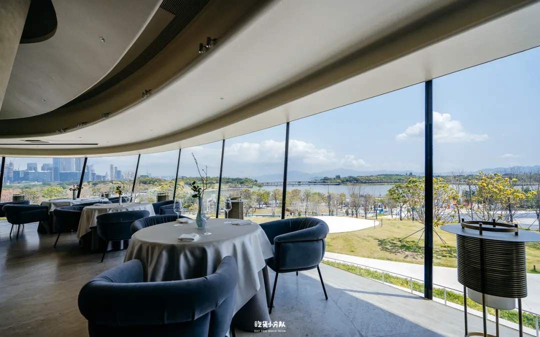 步入前厅,用餐视野瞬间开阔,一侧是城市的秩序与密度,一侧是海湾的流动与呼吸,远处山体起伏,近处林木摇曳,四重景观在同一画面中并置。
