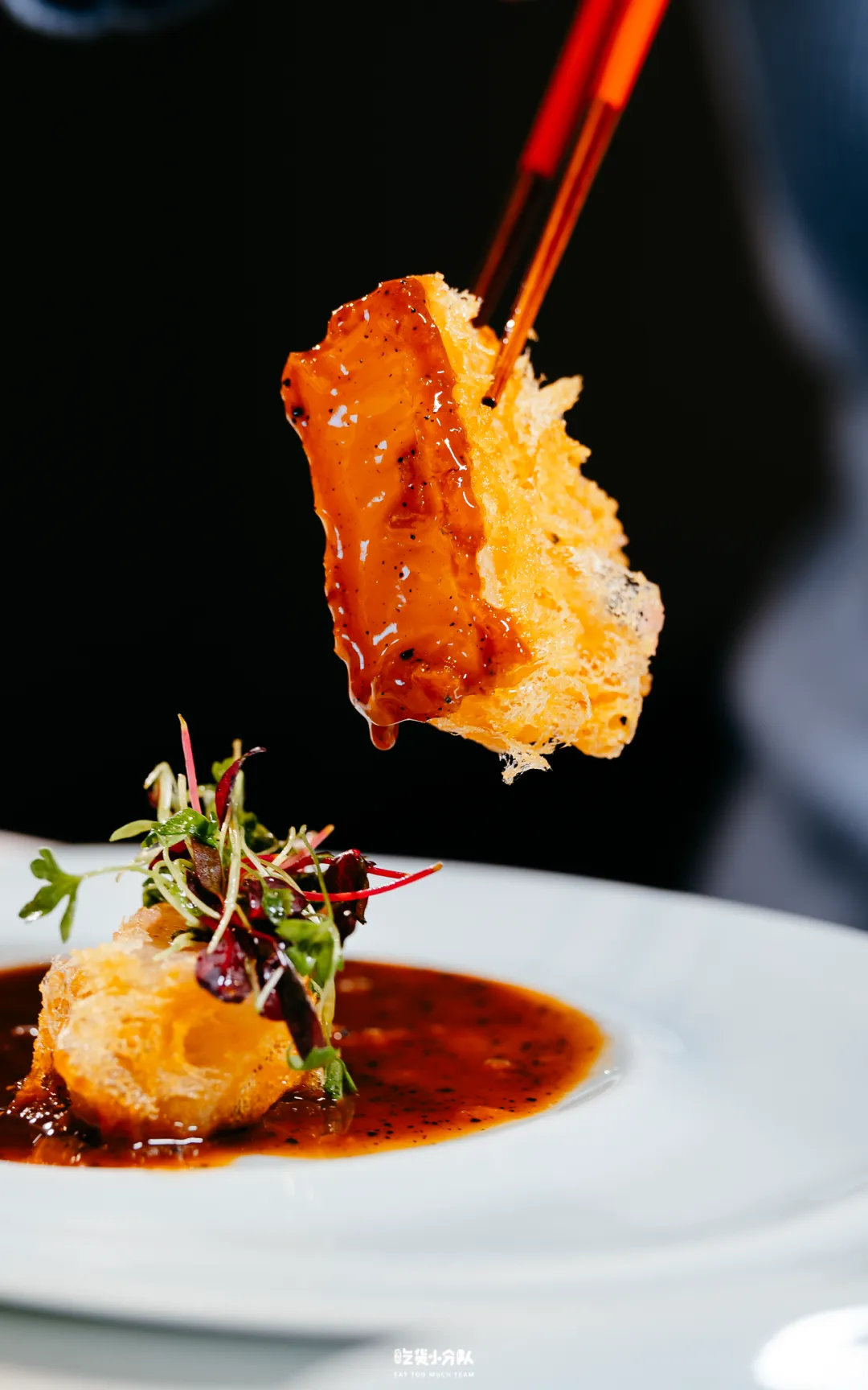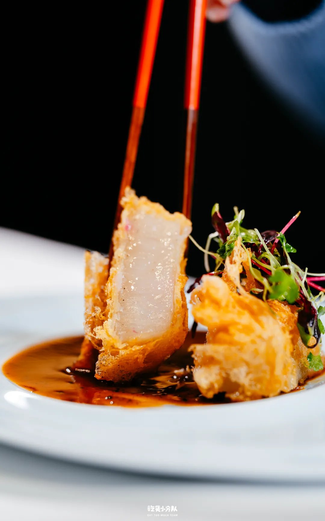 澳洲两头猪婆参,体型厚实、胶质丰盈。裹以脆浆粉轻炸,外层形成轻盈酥壳,内里仍保留糯润弹性的质地。佐以黑松露鲍汁收尾,酱体浓郁而克制。
