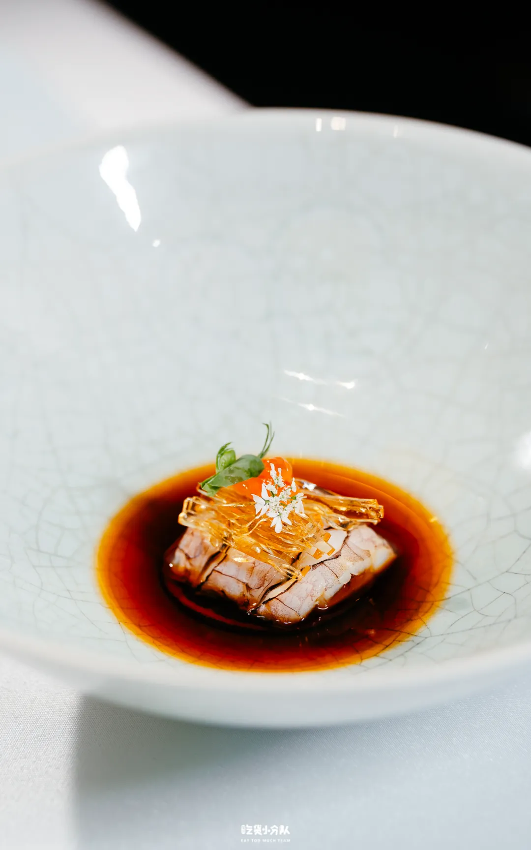 整席以茶为线索贯穿始终,冷萃红茶开场,清冽甘润;海鲜段落搭配生普,微涩与回甘交替,放大鲜味的层次;禽肉部分以熟普相承,汤感醇厚,收敛油脂;尾段则以老茶头收束,温润厚实,帮助消解与回甘。