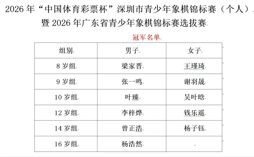 据悉,目前正值我市备战第六届全国智力运动会的冲刺关键期,本次青少年象棋锦标赛的举办,既是一次高水平的竞技比拼,更是以赛促练、营造全民健身浓厚氛围的重要举措。赛事相关负责人表示,推动群众体育赛事品牌化、提升象棋赛事影响力,是深圳象棋事业发展的重要方向。该赛事作为面向青少年的常设赛事,核心宗旨便是为广大青少年棋手搭建公平竞争、交流提升的平台,营造浓郁的象棋文化氛围,让更多青少年感受中华传统棋艺的魅力。同时,本次赛事作为2026年广东省青少年象棋锦标赛的选拔赛,以及深圳市备战第六届全国智力运动会的重要选拔环节,将进一步挖掘优秀青少年象棋人才,充实深圳青少年象棋后备人才库,助力深圳象棋事业高质量发展。