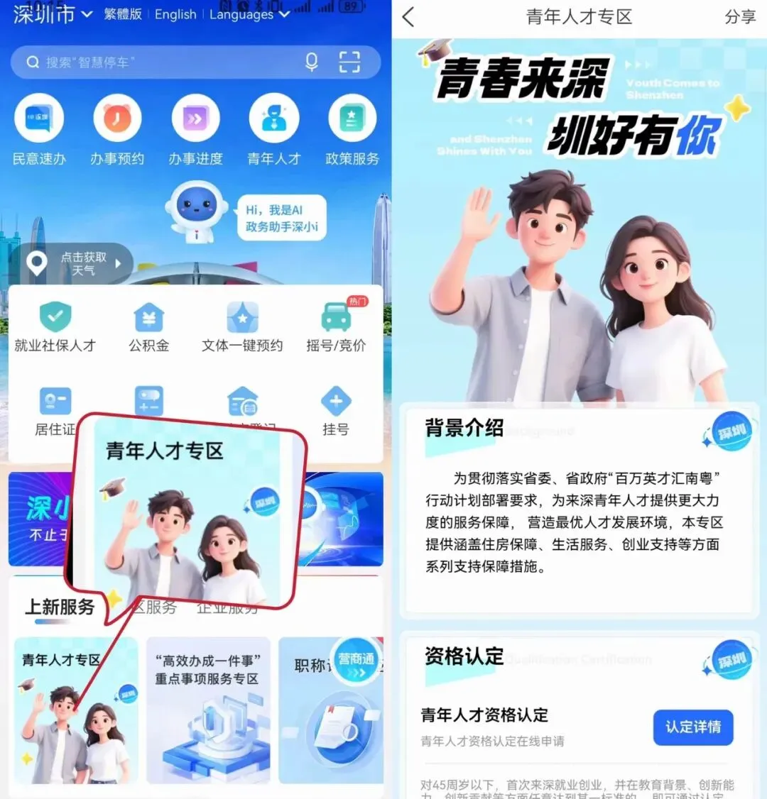 登录“i 深圳”APP→进入“青年人才服务保障专区”,在线提交相关材料即可完成资格认定,认定通过后,可同步申请住房保障、创业支持、入户补贴等各项政策福利,“一次认定、全程通用”。