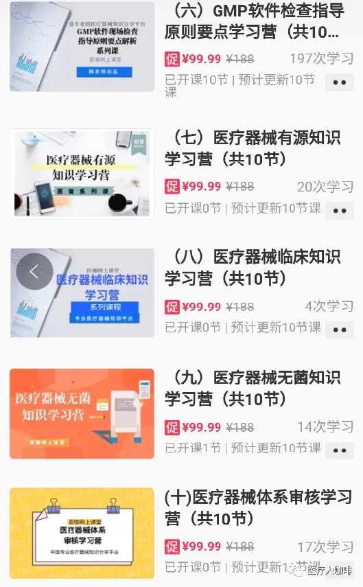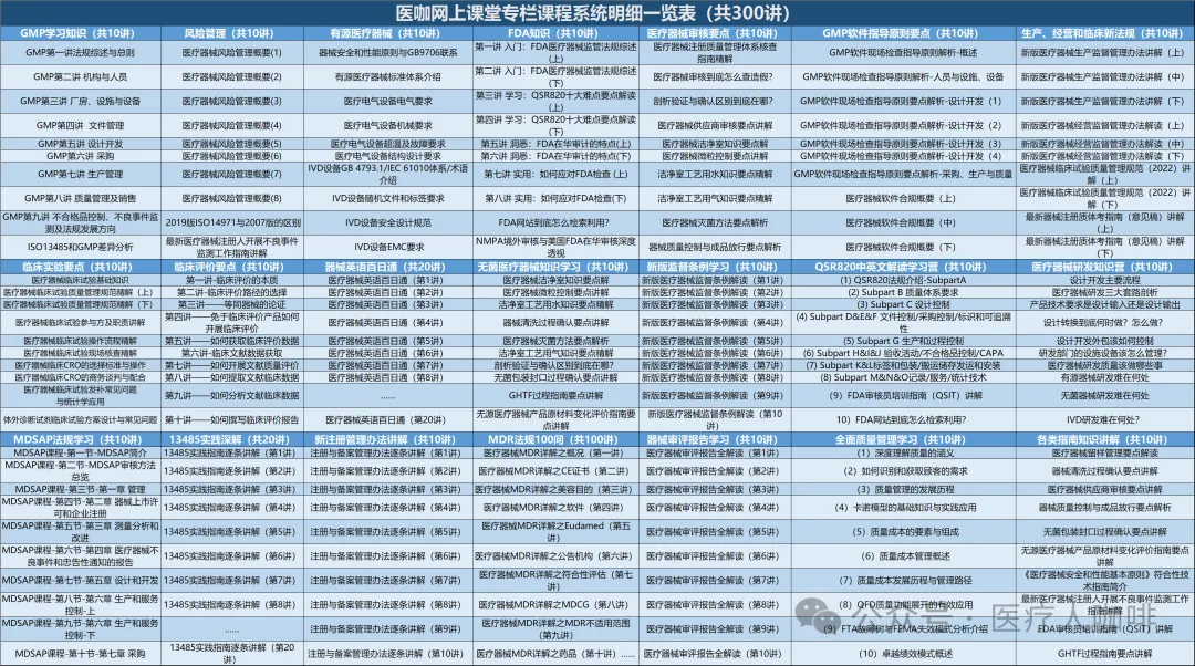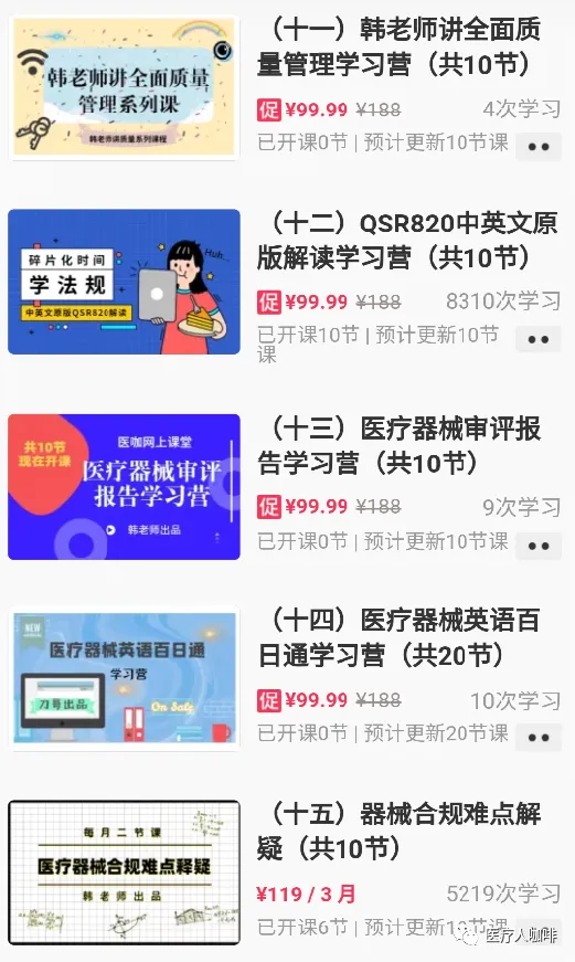 我们开设医咖网上课堂的初心就是为了方便大家学习,特别是利用零碎的时间利于上下班路上,饭后睡前的时间,能够随时随地系统性地学习医疗器械法规知识。医咖网上课堂开播四年多来,先后开设了GMP体系、13485、FDA、无菌、有源、注册、软件合规、器械英语、审评报告、全面质量管理、职场等800多节课程,深受业界欢迎!