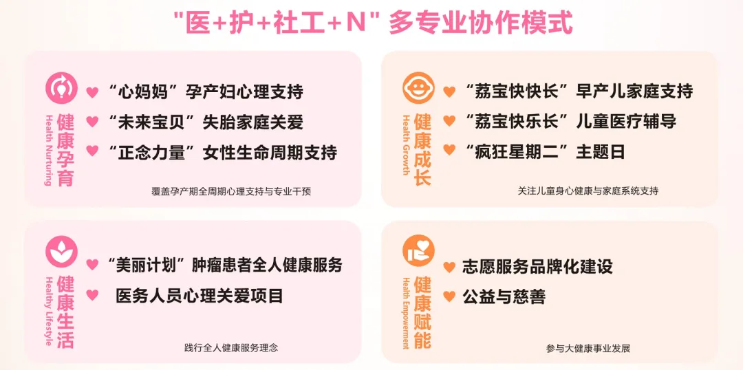 经过16年的发展,医院社工已实现从“个体服务”到“多元协作”的系统转变,建成一支专业的社工团队,年均服务达6000余人次。在党建引领下,逐步构建起“医+护+社工+N”多专业协作模式,联动“社工+志愿者”力量,围绕妇女儿童“孕、产、生、长、病”全周期,践行“生理—心理—社会—灵性”全人健康服务理念,打造具有妇幼专科特色的4H服务体系。