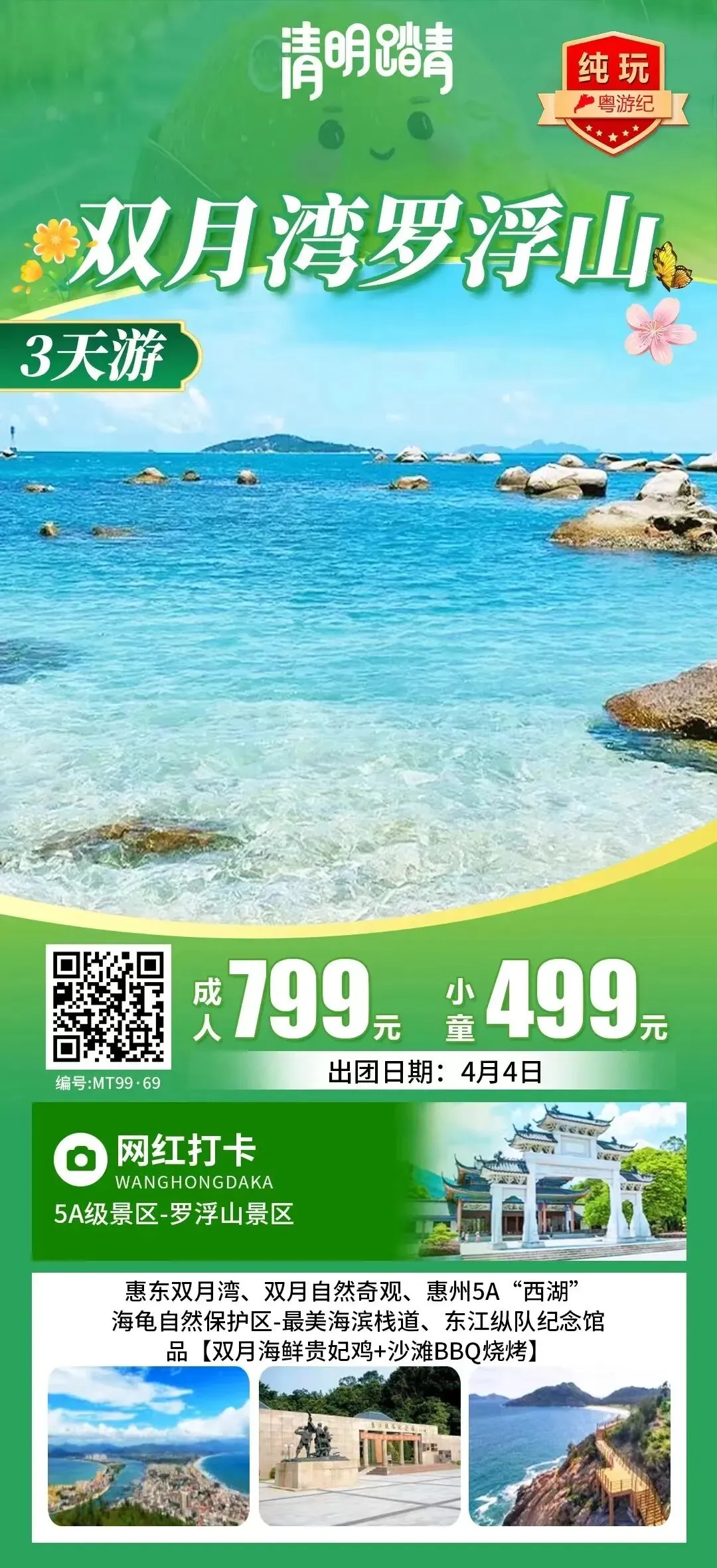 清明假期深圳周边三日游,惠东双月湾、双月自然奇观、海龟自然保护区-最美海滨栈道、惠州西湖、罗浮山景区、东江纵队纪念馆、沙滩烧烤
