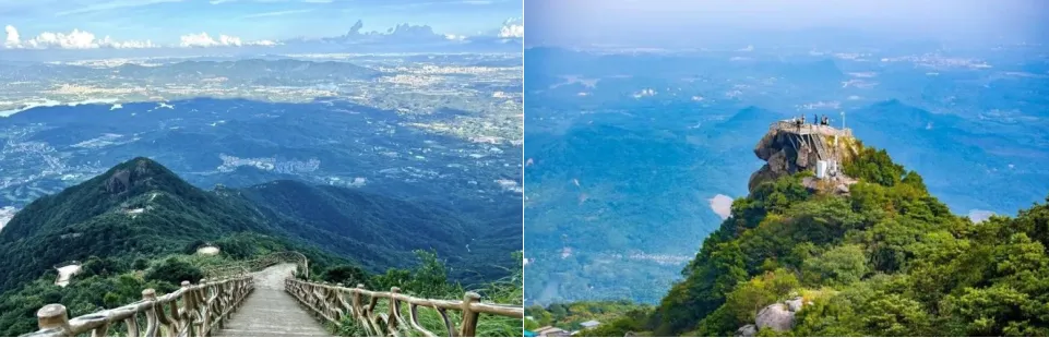 罗浮山间赏仙云罗浮山主峰飞云顶海拔1296 米(岭南第一高峰)(不含往返缆车),峰顶盘圆平坦,花草并茂,云雾缭绕,日出可与泰山媲美。景区内大小山峰432 坐,飞瀑名泉 980 多处,洞天奇景 18 处,石室幽岩 72 个。 风光清幽秀丽、气候宜人,又被道教称为第七洞天,第三十四福地。与南海市境内的西樵山为姐妹山,故又名东樵山。