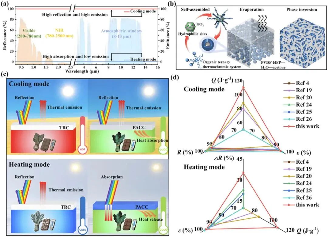 理想热管理材料的概念设计与性能评估。(a)理想热管理材料在加热和冷却模式下的光谱特性;(b)PACC涂层的制备工艺示意图;(c)PACC涂层在加热和冷却条件下的温度调节性能;(d)PACC涂层与之前研究中报道的先进多功能热管理材料的性能对比。