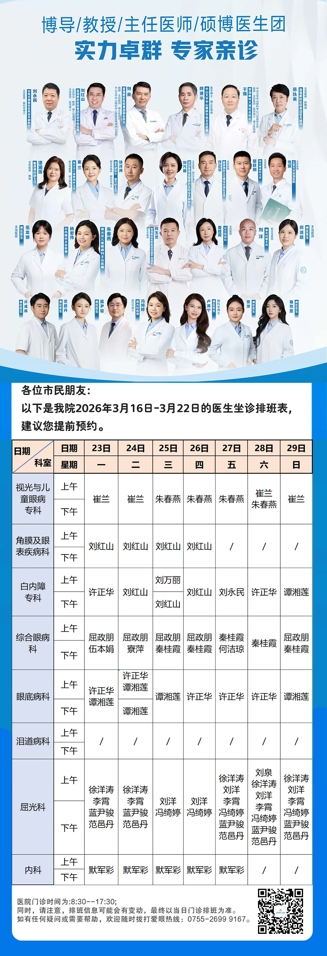 >深圳普瑞眼科医院本周(3月23日-3月29日)医生坐诊排班表新鲜出炉啦!