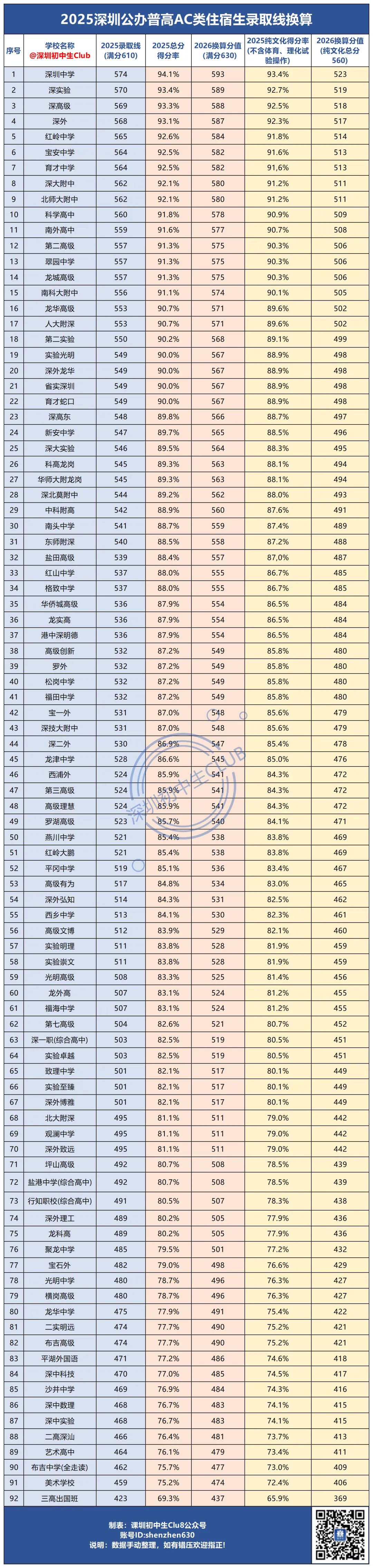 2025年深圳中考满分610分,深圳中学AC类住宿生录取分数线574分,占中考满分比例约为574/610≈94.1%。这时,【94.1%】就是2025年深中AC类住宿生中考总分的得分率。