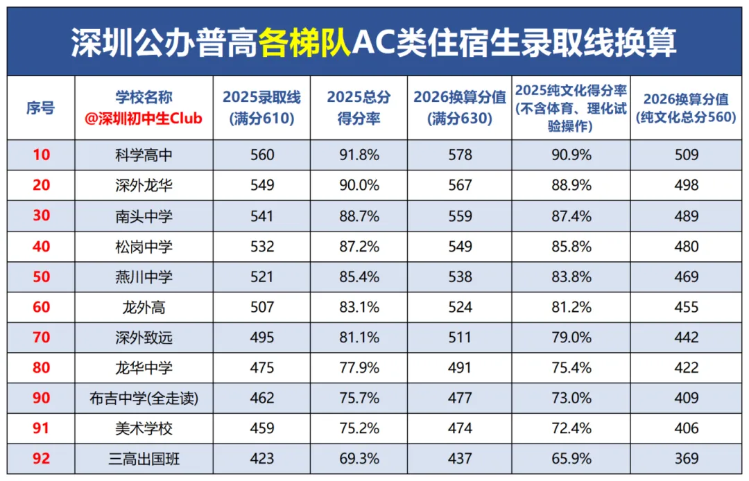 那么,2026届中考生目标10大、20大、30大...分别需要多少分?参考2025年中考录取线换算表,对公办高中各梯队AC类住宿生门槛线进行了整理,供大家参考。