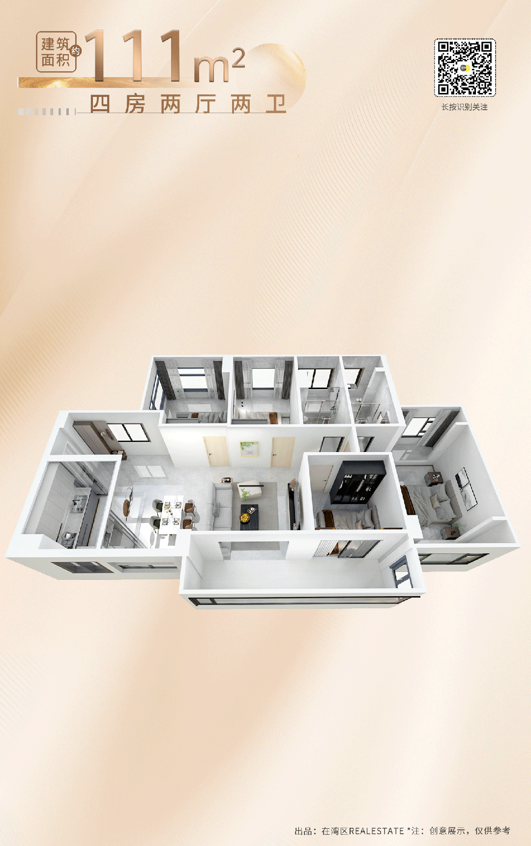 约111m²四房户型,直接将居住体感,提高到市面约130m²旧规改善的尺度。