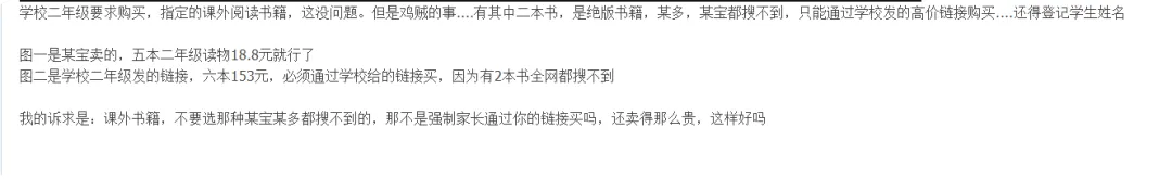 近日,有深圳的小学生家长在问政平台上留言,反映被学校要求购买指定课外书。这位家长反映称,龙岗某小学二年级,要求学生购买指定的课外阅读书籍,对于要购买课外阅读书籍这件事情,他(她)并不反对,但是学校的做法是只能通过学校发的高价链接购买,需要等级学生的姓名,售价比在电商平台上高很多,并且有2本身还是绝版的,全网都搜不到。他(她)质疑这种做法的合理性,要求教育部门给个说法。该校为“深圳市每周半天计划”的试点学校,自2025年秋季学期起开展“书香校园”阅读特色建设,推行每周半天阅读计划。3月8日,该校二年级6班一名家长在班级群中分享个人阅读书目的购书链接,供其他家长参考选用,并说明“家长可通过该链接或其它电商平台自行选购,按需购买即可”,未作强制性要求。经核查,该链接为“快乐读书吧”二年级推荐阅读书目,各主流购物平台均可搜索购买。目前,学校已安排教学处和二年级组长到各班做好解释工作,明确阅读书目根据自身需求选择购买、借用或少量阅读,完全自愿。下一步,我局将严格规范学校教育教学行为,严禁任何形式强制或变相强制学生购买教辅及课外读物,同时督促学校加强对家委会工作的指导与管理,畅通家校沟通渠道,及时回应家长关切,消除家长顾虑,切实维护学生和家长的合法权益。从教育局的回复来看,这件事情与学校、老师无关,是某个家长的私自行为,出发点是分享个人的购书渠道,供其他家长参考,未作强制要求,却被当事家长误会为是学校或者老师授意的,从而产生了不满情绪。应该说,在这件事情上,学校和老师都是无辜的,但是当事家长的反应也情有可原。因为在现实中,学校或老师为了推责,授意个别家长强制或变相强制学生购买教辅及课外读物确实存在。这就需要学校和老师加强自律,同时加强引导,要求家长尤其是家委不要乱发类似信息,以避免类似情况的发生。当然,教育主管部门也要加强监管,督促学校和老师不要做出违纪违规行为。