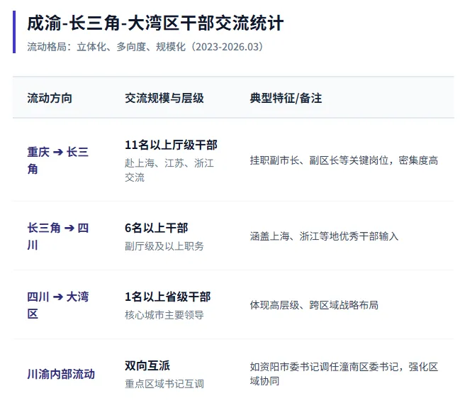 更为重要的“人才三角”,从单向学习到双向赋能:交流模式从传统的“中西部干部到沿海学习” 向双向流动、双向赋能转变;重庆→长三角:11名干部赴上海、江苏、浙江挂职;长三角→四川:上海、浙江干部调入四川任职;四川→大湾区:省级干部调任深圳市委书记;长三角→重庆:上海干部调任重庆市副市长。
