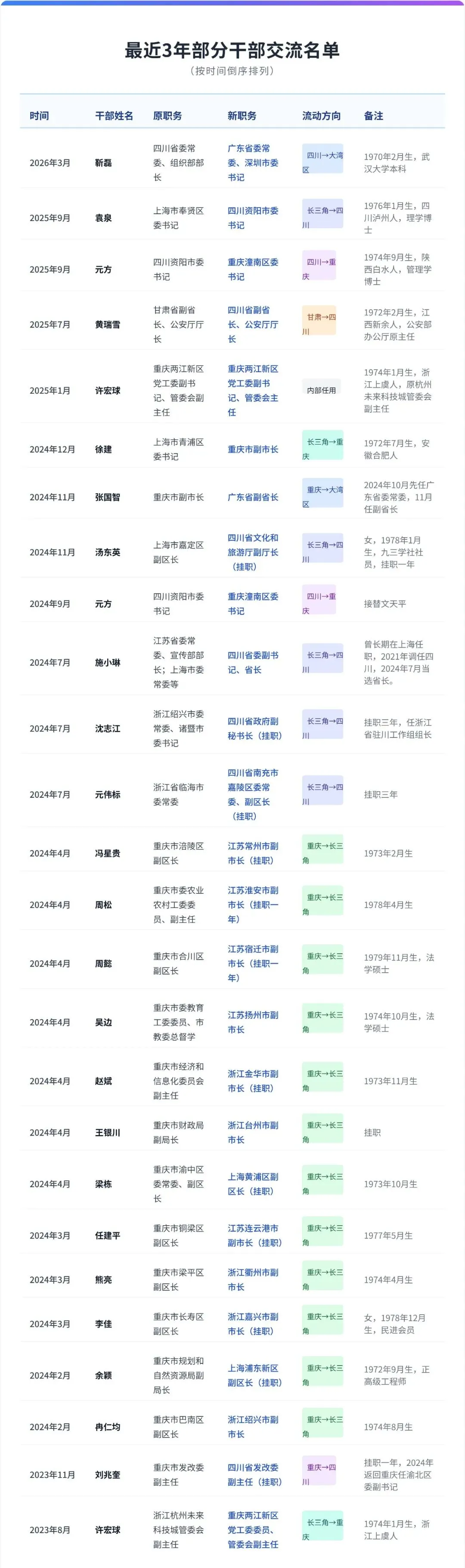 川渝内部流动:四川与重庆之间也有重要干部交流,如四川资阳市委书记调任重庆潼南区委书记。