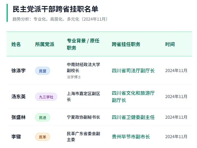从专业化来看,多位民主党派干部跨省挂职。 2024年11月,4名民主党派干部同时跨省挂任四川副厅级职务,体现了专业化、多元化的交流趋势:徐涤宇(民盟):法学博士,中南财经政法大学副校长→四川省司法厅副厅长;汤东英(九三学社):上海市嘉定区副区长→四川省文旅厅副厅长;张盛林(民进):宁夏政协副秘书长→四川省卫健委副主任;李键(民革):民革广东省委会副主委→贵州毕节市副市长(涉及大湾区)。