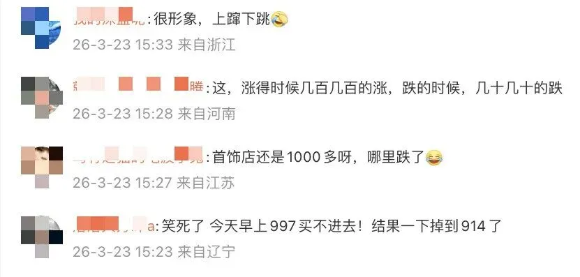 3月23日,国内金价跌破1000元/克。截至13:36,国内现货金价报967元/克;国内期货金价报966.84/克。多家品牌金饰价格继续下行。