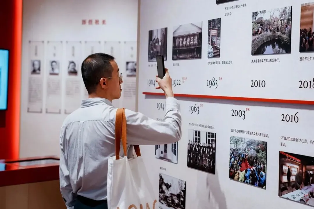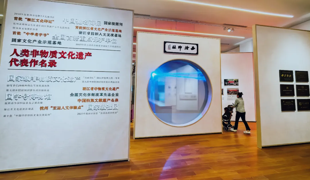 西泠印社品牌馆展区以“百年西泠·文脉传承”为核心,采用仿宣纸三角册页造型,融合孤山社址的前山石坊、连廊、圆洞门等标志性元素,呈现篆刻艺术与空间意境的交融。通过“文化+数智+互动”的展陈方式,带领观众沉浸式感受金石文化的深厚底蕴。