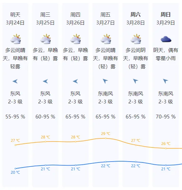 3月25日—28日多云为主,早晚有轻雾或雾,白天可见阳光,午间较热;