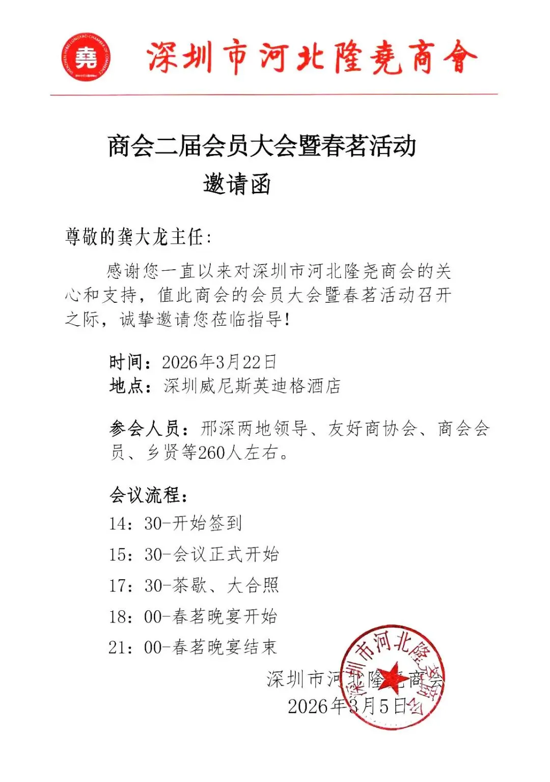2026年3月22日,深圳市河北邢台商会&深圳市河北隆尧商会共同举办的2026春茗会在深圳举行。冀粤两地政府相关部门领导,商会顾问和特邀嘉宾,大湾区友好商协会会长和秘书长,工商界知名人士,行业专家,优秀企业家,媒体记者,XXX全体会员等共同参会。交流促发展,合作谋共赢,广东营商服务中心主任、湾区湘商秘书长龚大龙应邀出席。