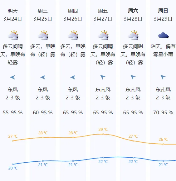 25日-28日,多云为主,早晚有轻雾或雾,白天可见阳光,午间较热。